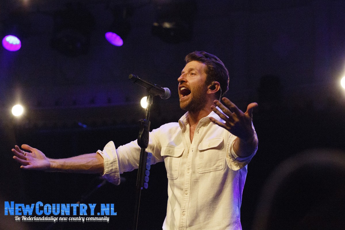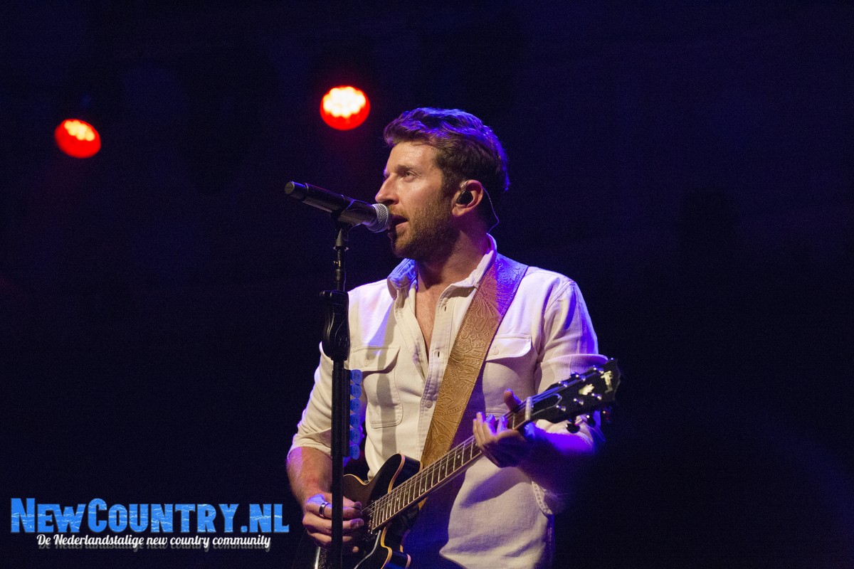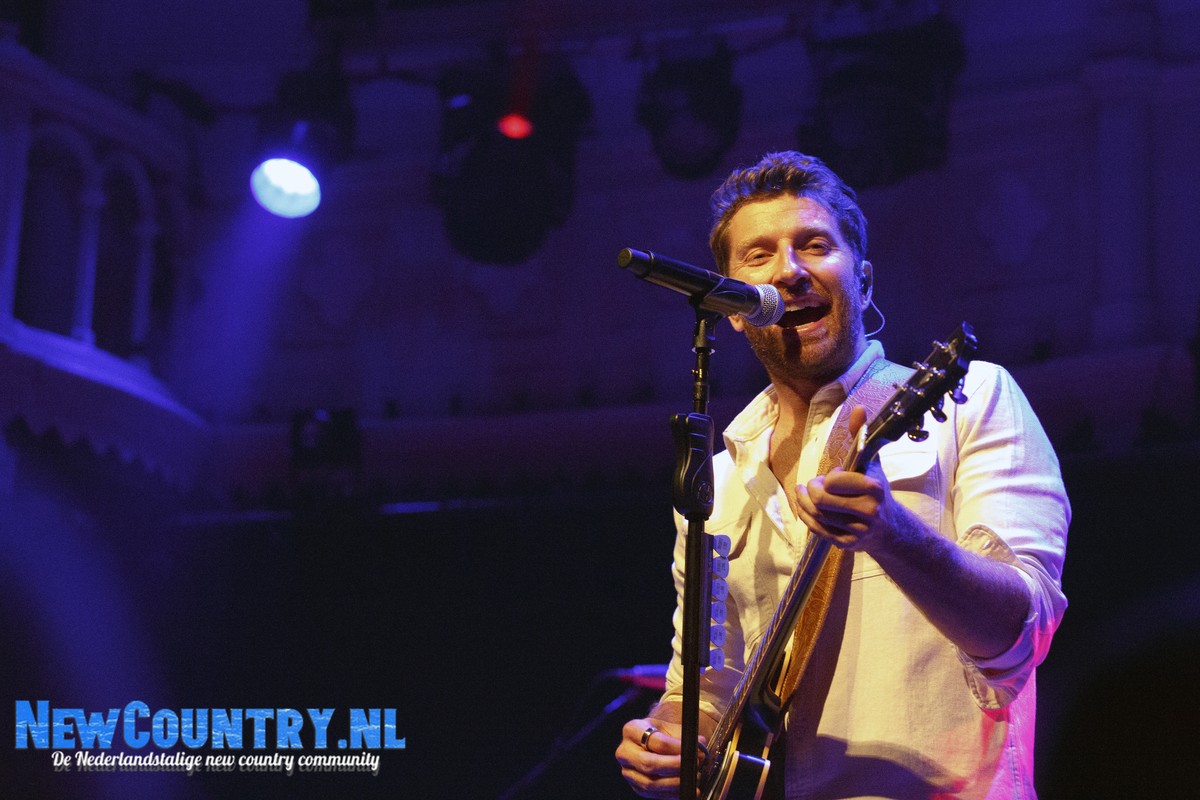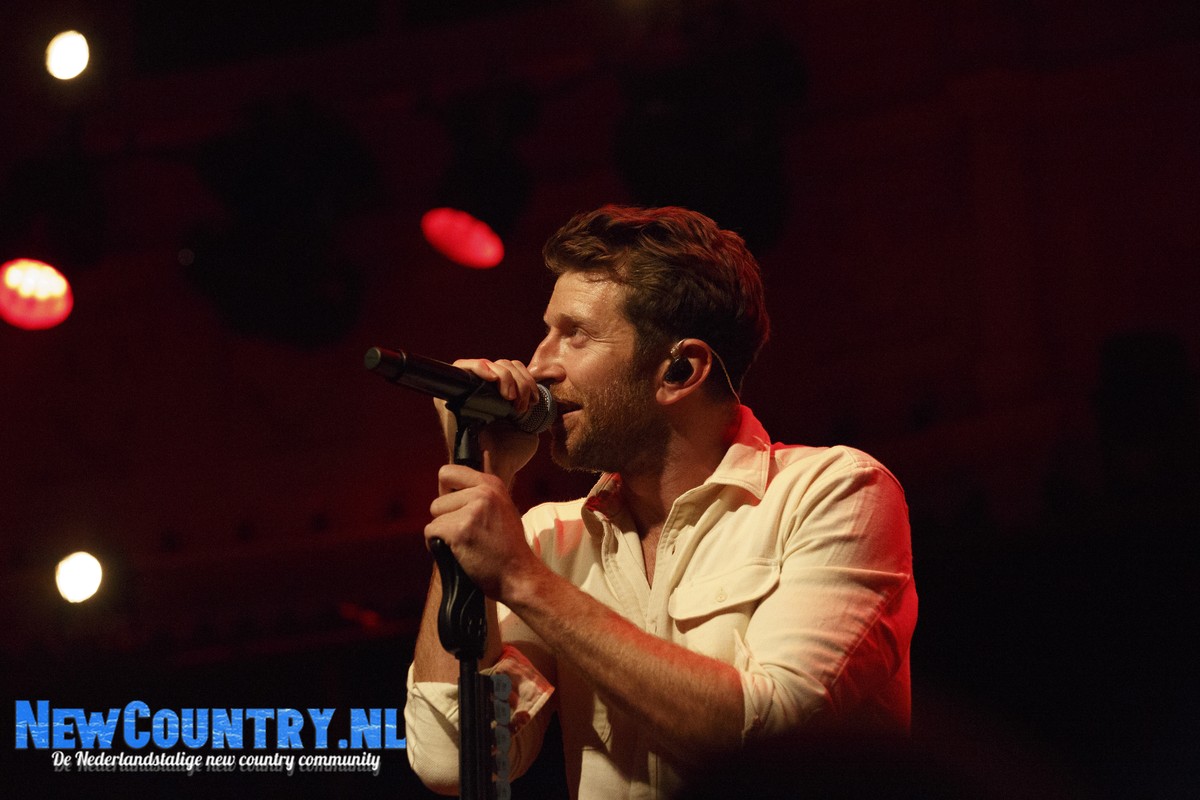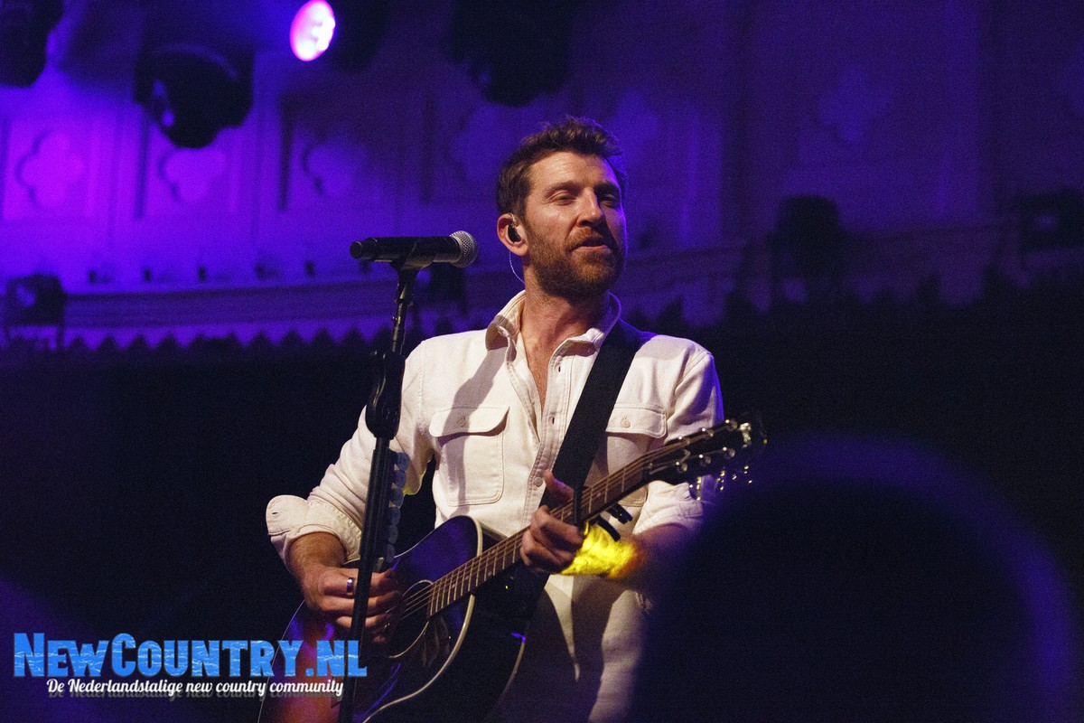 Direct nadat Jenkins met gitaar het podium heeft verlaten, is er al wat spanning voelbaar in de zaal. In een intieme setting als Paradiso is het bijzonder te noemen een artiest als Brett Eldredge, met negen hitlijstnoteringen op zijn naam in de VS, te mogen verwelkomen. Daarbij mag worden opgeteld dat menig vrouwelijk bezoeker niet geheel ongecharmeerd is van het uiterlijk van de zanger… Toch zijn het zowel VROUWEN-áls mannenstemmen die even over half negen de zanger met een daverend gejuich ontvangen. In enkel blauwkleurige podiumlampen tast Eldredge het Amsterdamse publiek even af, totdat hij kordaat op de microfoonstandaard af stapt en met zijn herkenbaar guitige blik de zaal in kijkt. De zanger die recentelijk zo openlijk uitkwam voor zijn angststoornis, zoekt het vertrouwen van het publiek, welke vanaf minuut één ademloos aan zijn lippen hangt.